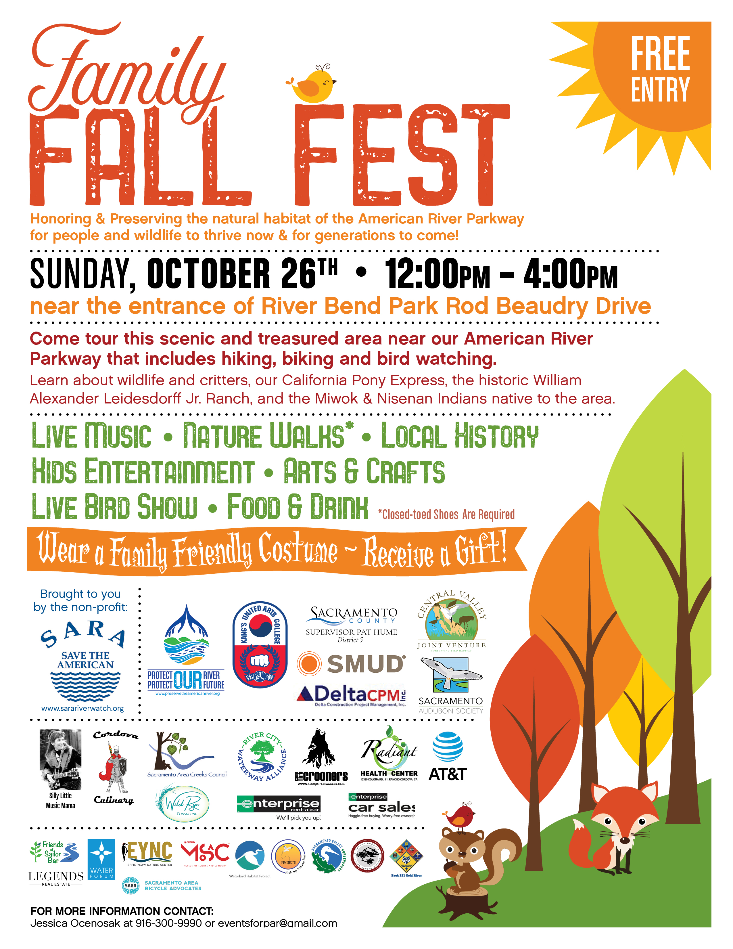 American River Bike Patrol, American River Trees, AT&T, Authors, Marni Fylling, Ashley Shult Langdon and Aaron Haiman, California Dept. of Fish & Wildlife, California Fly Fishing Unlimited, California Wildlife Encounters, Campfire Crooners Band, Cathi Birch, Central Valley Join Venture, Cordova High School Culinary Academy, Cordova Recreation & Park District, Cub Scout Pack 281, Cultural Connections, Delta CPM Construction Project Management, Ducks Unlimited, Effie Yeaw Nature Center, Enterprise Rent-a-Car & Sales, Events by Jessica, Folsom Cordova Unified School District, Friends of Bushy Lake, Friends of Sailor Bar, Helen Whelan-Beshaw, Kang’s United Arts College, Legends Real Estate, Listos California/Cal OES, MOSAC, Palomacy Pigeon & Dove Adoptions, Photographs by Doug Herr, Preserve the American River, Project: Pick Up Fishing Line, R/C Country Hobbies, River City Waterway Alliance, Rosey’s Beadings Designs, Sacramento Area Bicycle Advocates, Sacramento Area Creeks Council, Sacramento Audubon Society, Sacramento County Board Supervisor, Pat Hume, Sacramento Splash, Sacramento Valley Conservancy, Save the American River Association, Save the Snakes, Silly Little Music Mama, SMUD, The Lisa Phenix & Friends Band, The Radiant Health Center, Water Forum, Waterbird Habitat Project, and Wild Rye Consulting.